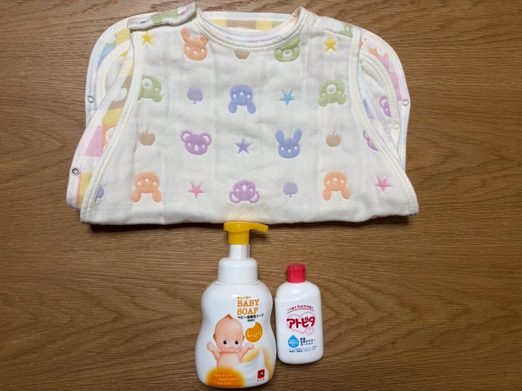 スリーパー、ボディーソープ、保湿クリーム、爪切り